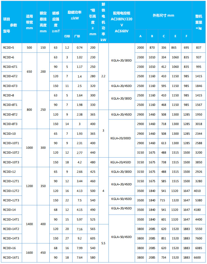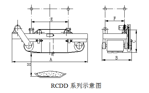 四、RCDD系列懸掛帶式自冷電磁除鐵器主要技術參數(shù)、外形尺寸 執(zhí)行標準:JB/T7689